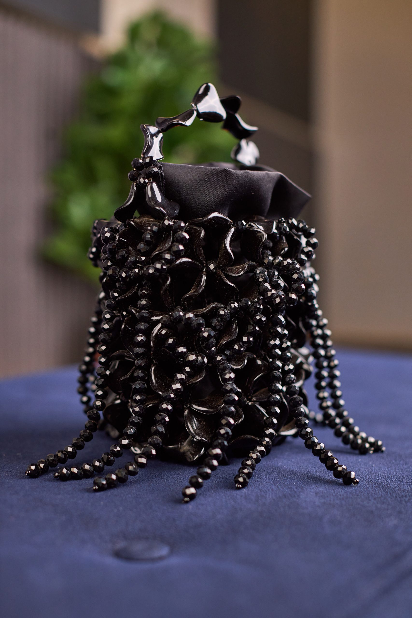 A sculptural statement piece crafted for the woman who loves art she can carry. This design features an intricate arrangement of translucent green florals, each one shaped and woven by hand. Delicate beaded tendrils flow from the body of the bag, creating a cascading effect that adds movement and shine with every step.