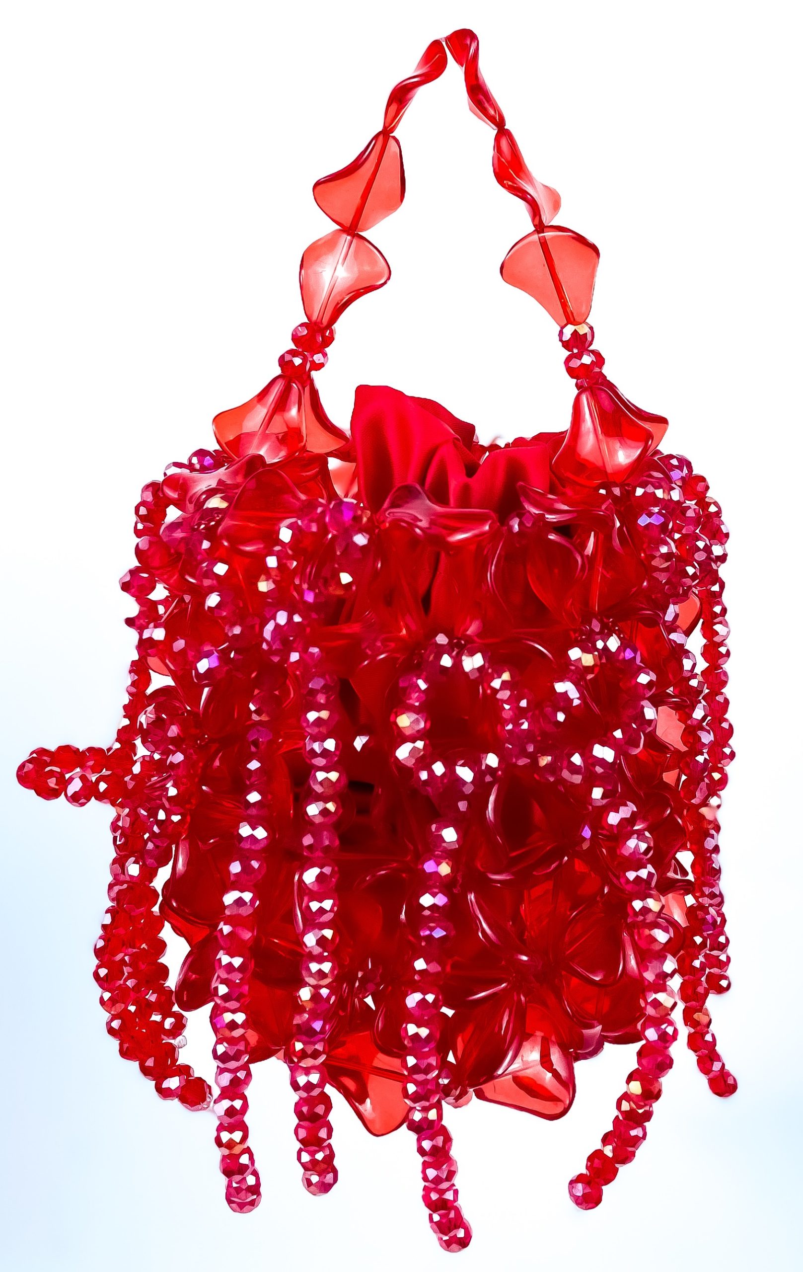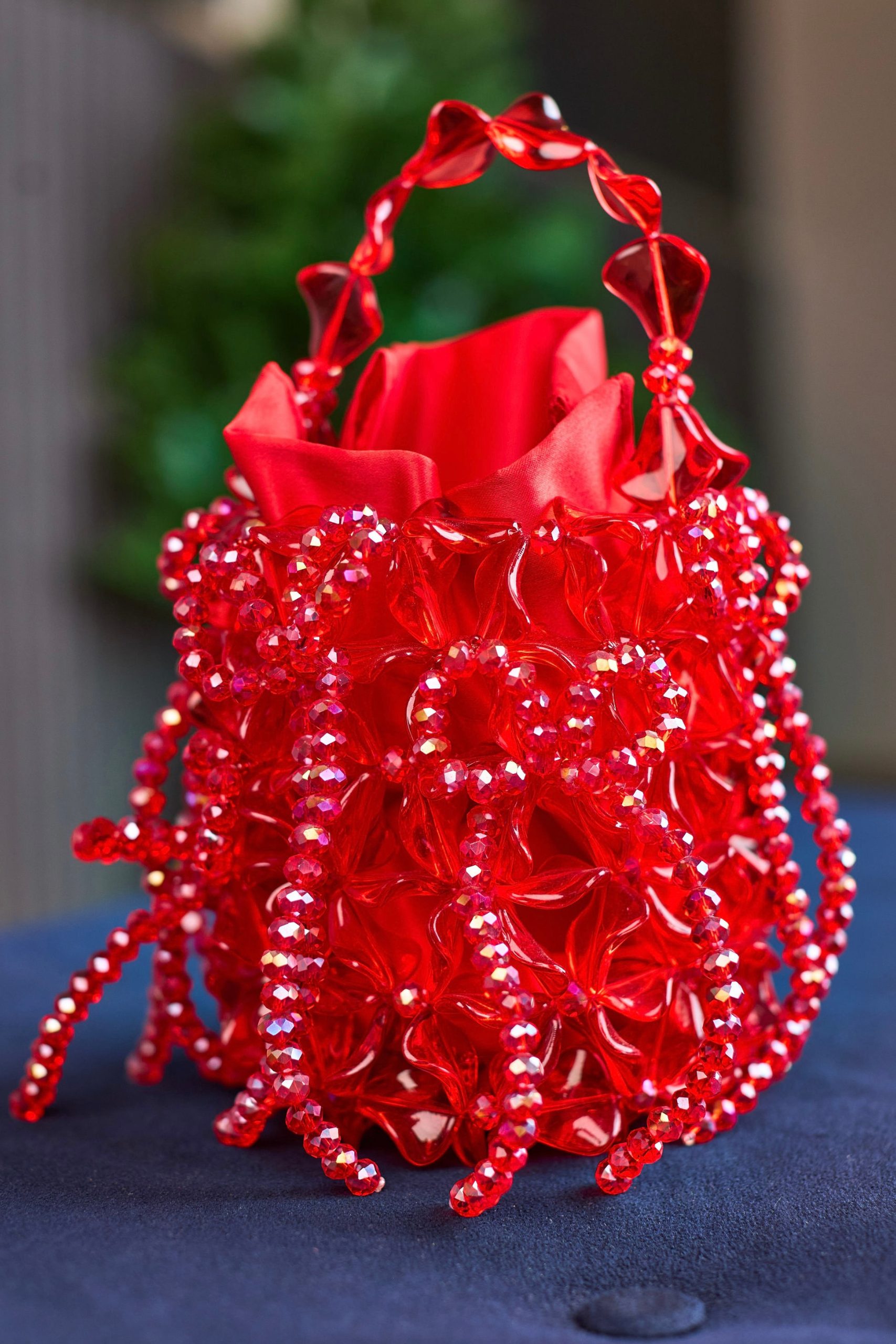 Hoya is a vibrant celebration of colour and craftsmanship. Designed in a rich, fiery red, this handcrafted piece features sculpted floral elements woven together to create a textured, dimensional silhouette. Cascading strands of glossy beads drape gracefully from the body of the bag, adding movement and a shimmering finish that catches the eye from every angle.